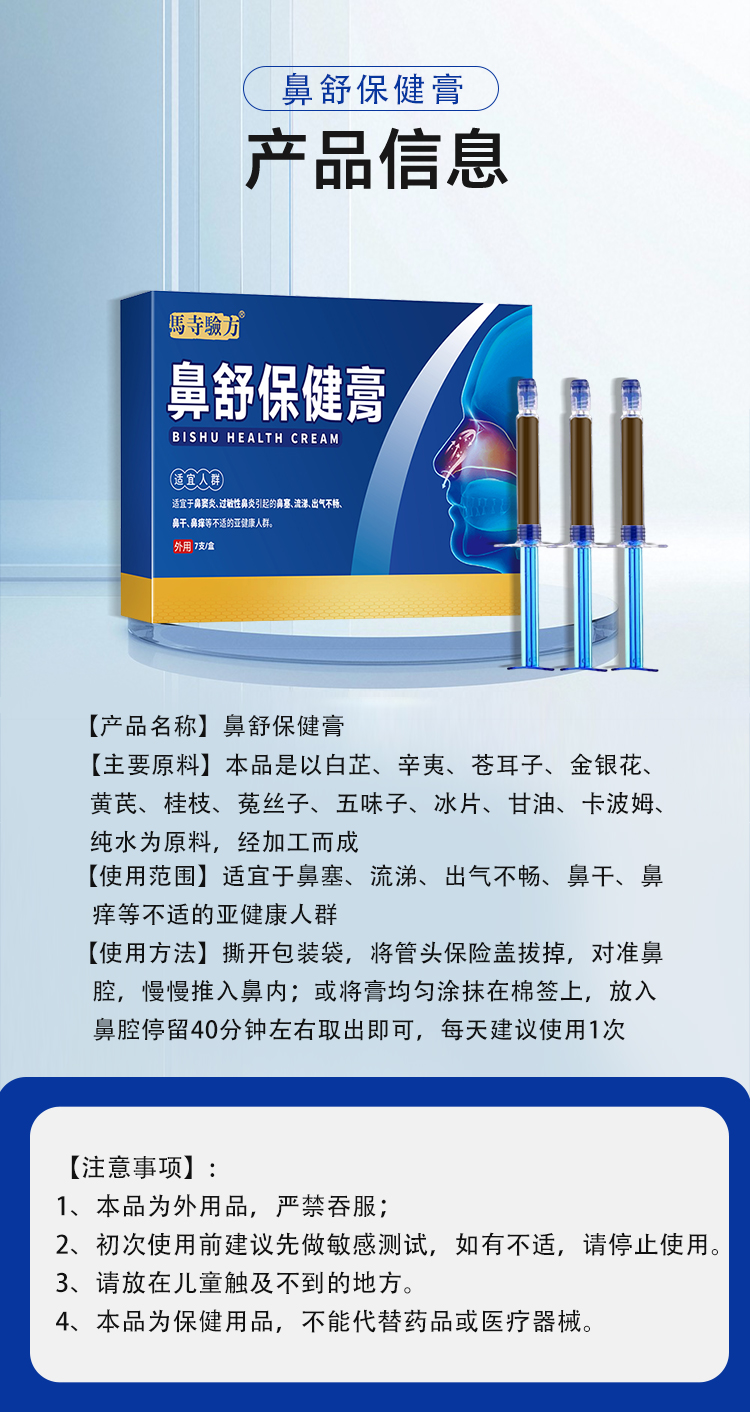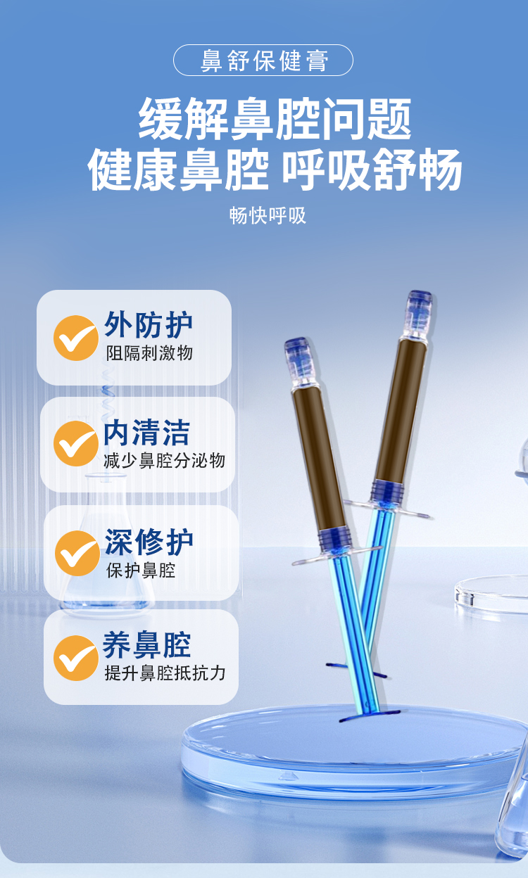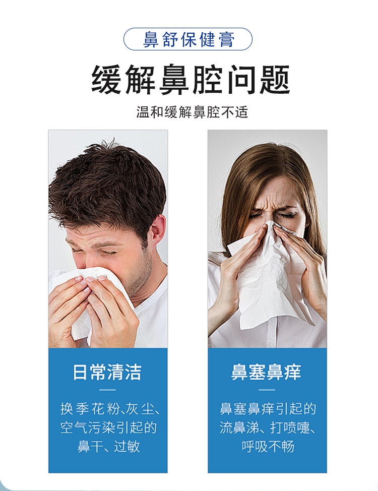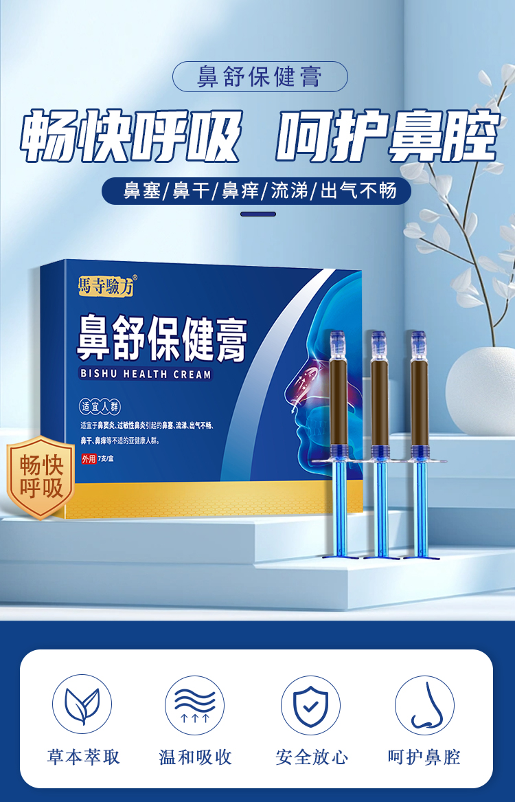 鼻舒保健膏,以草本成分為主的鼻腔護(hù)理產(chǎn)品,適用于鼻塞、鼻干、鼻癢、流涕、出氣不暢等鼻部不適,規(guī)格為7支/盒,將管頭保險(xiǎn)蓋拔掉,對準(zhǔn)鼻腔,慢慢推入鼻內(nèi),每天建議使用1次,源頭廠家,多樣化oem貼牌代加工。