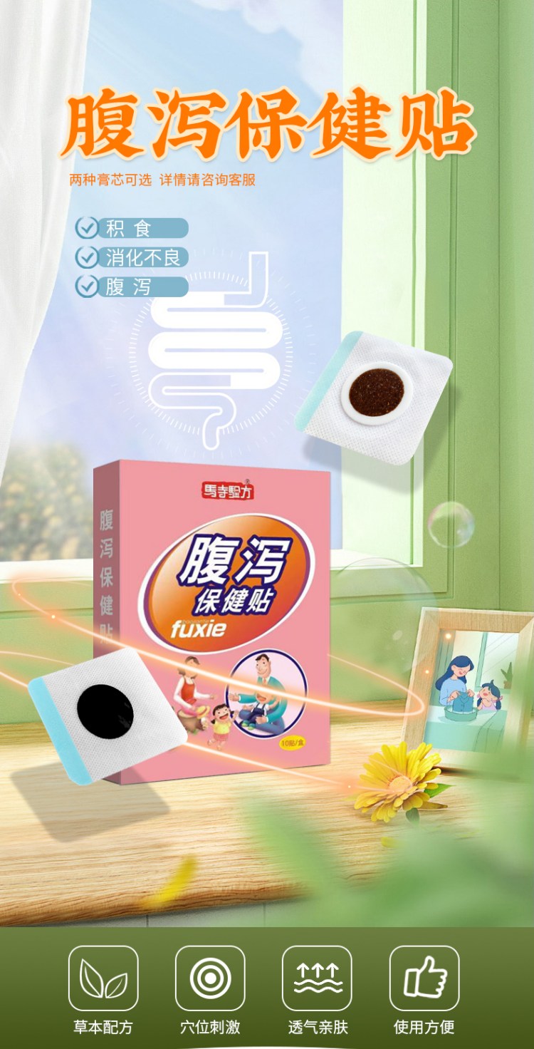 馬寺驗方腹瀉保健貼,是洛陽今世康膏藥廠家專注生產的馬寺驗方品牌腹瀉貼,適用于積食、消化不良、腹瀉、腸胃不適等人群,草本配方,科學配方,舒適透氣不悶熱。源頭廠家,oem貼牌代加工定制,快速出貨。